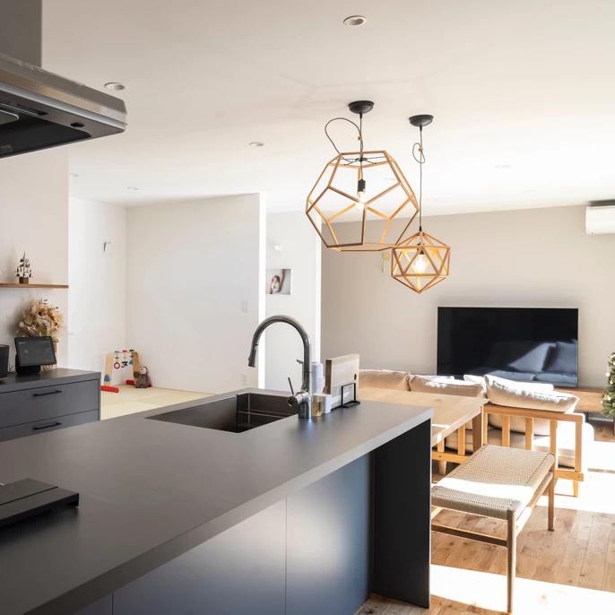 部屋全体を見渡せるキッチンを中心に、すべての居場所が自然と繋がる設計です。どこにいても家族の気配を感じられる温かいつながりが生まれ、穏やかな時間が流れる住まいです。