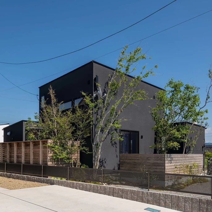 外観はすっきりとしたブラックで、シンプルに。窓の配置にも建築家のこだわりが見える、おしゃれなファサードは一際目を引く外観です。