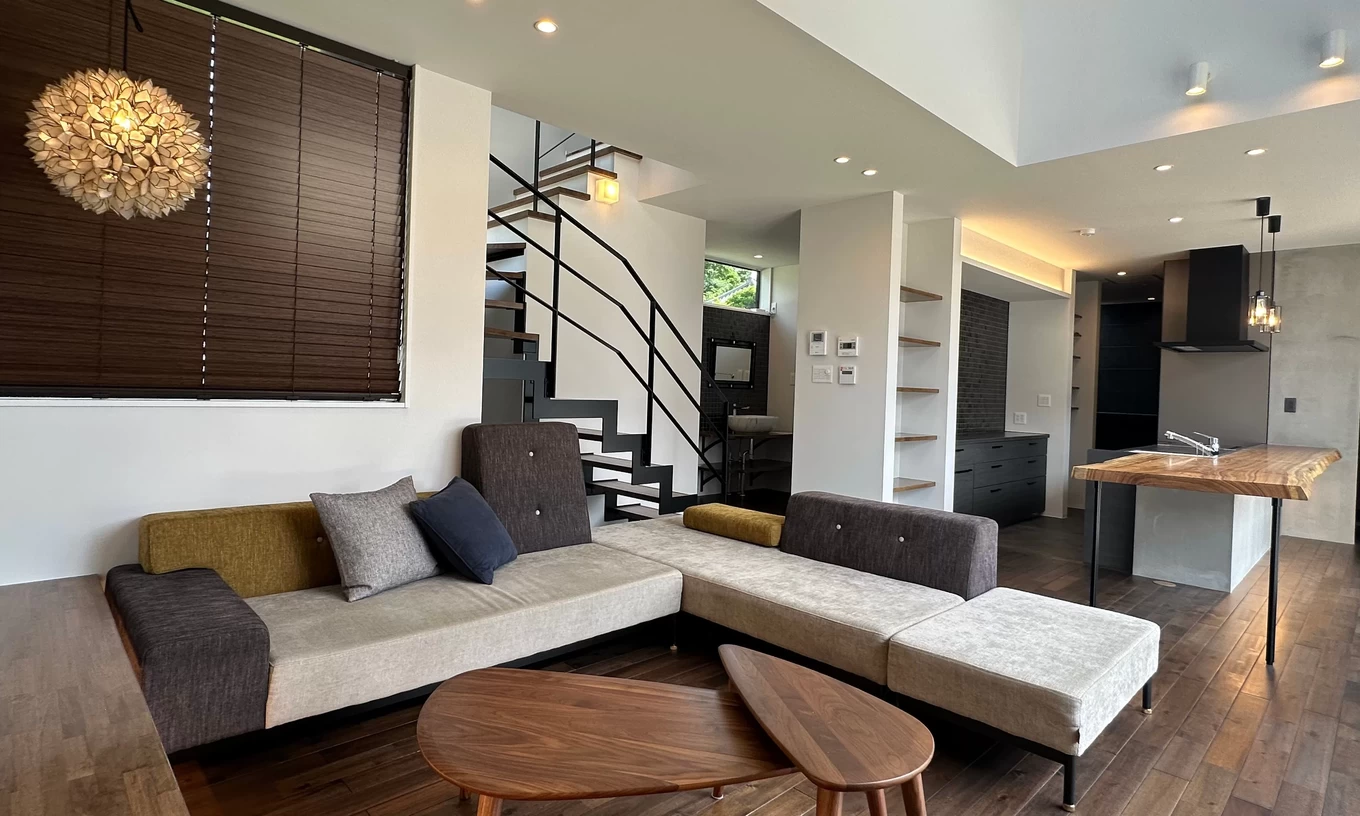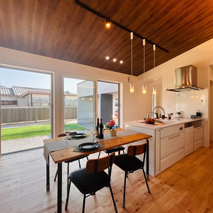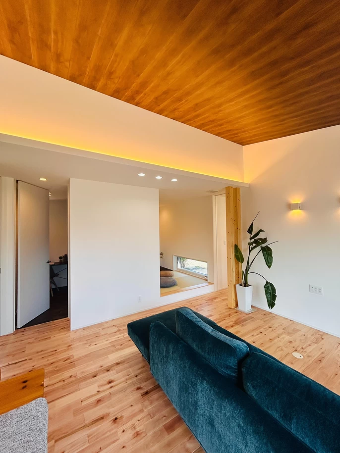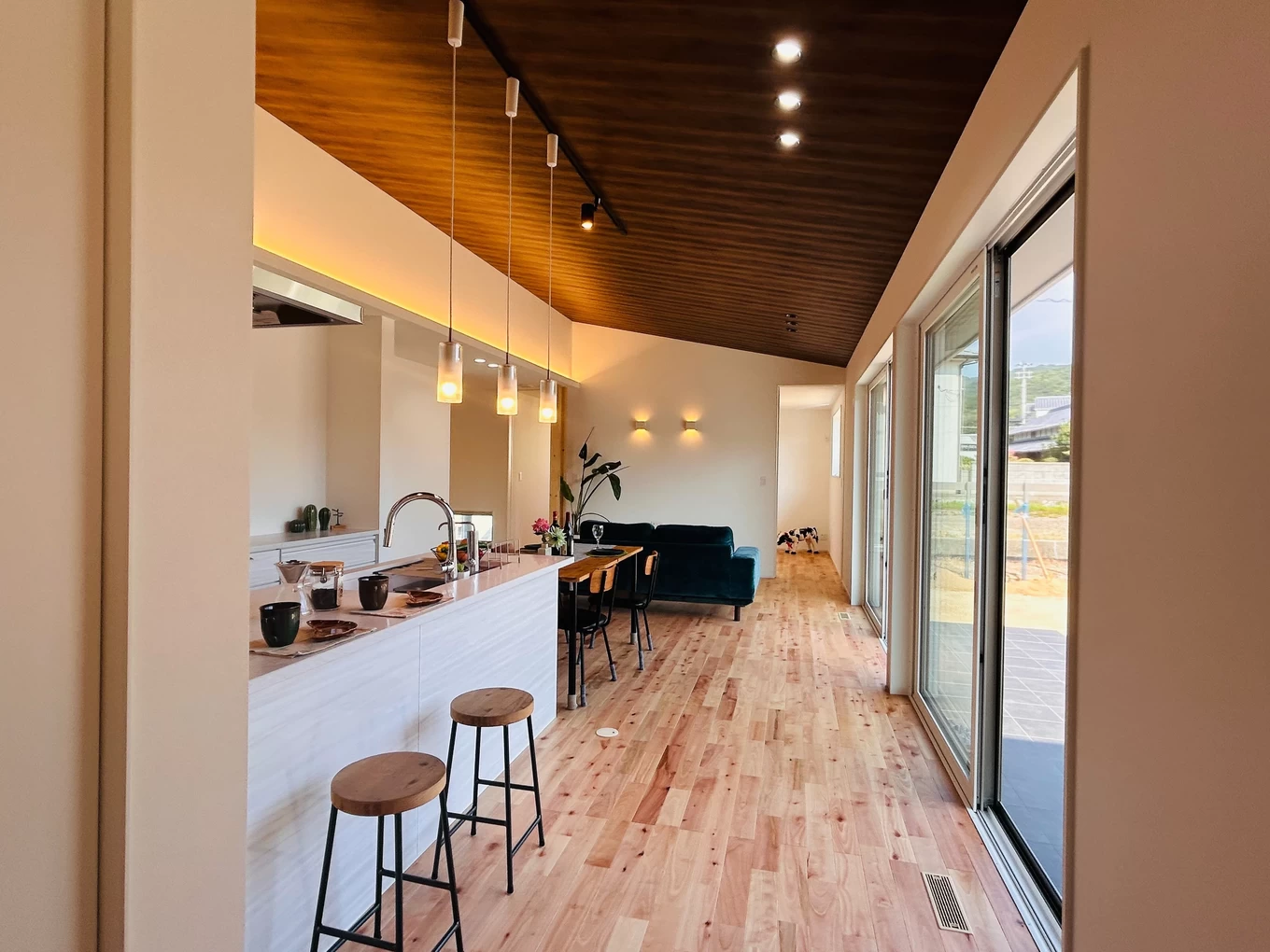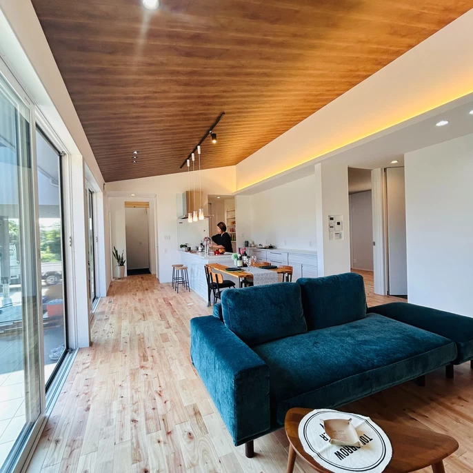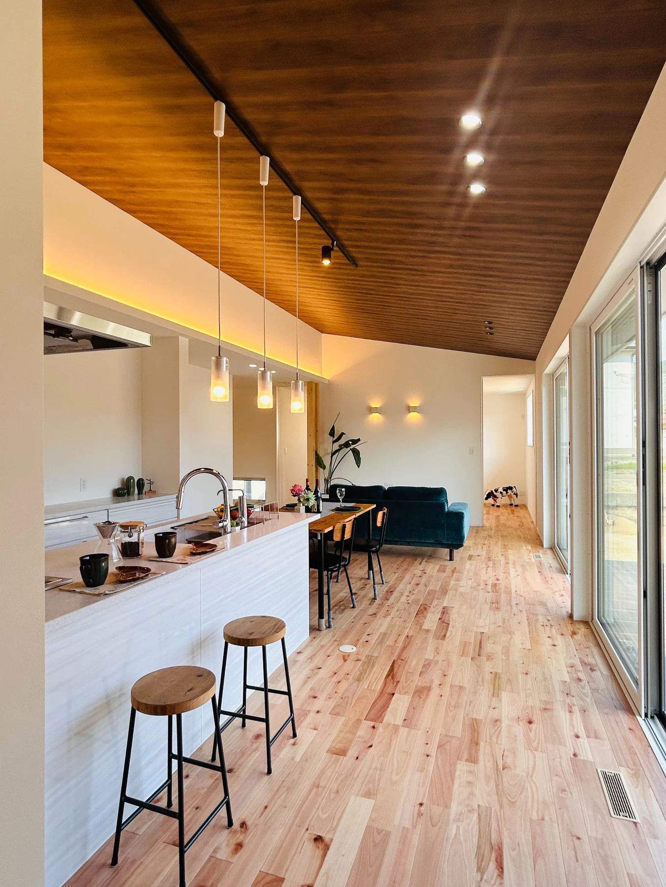勾配天井で開放感のあるリビングは、子供部屋、和室、書斎、寝室すべてにすぐつながっているので、ふとした瞬間にキッチンでお料理する姿も見えて安心。