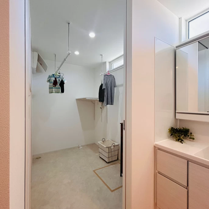広めの洗面所の隣にはバスルームにつながる脱衣室。洗濯するのも干すのももちろん、逆サイドには大容量のFCLがあるので洗濯物を簡単にしまうことができます。