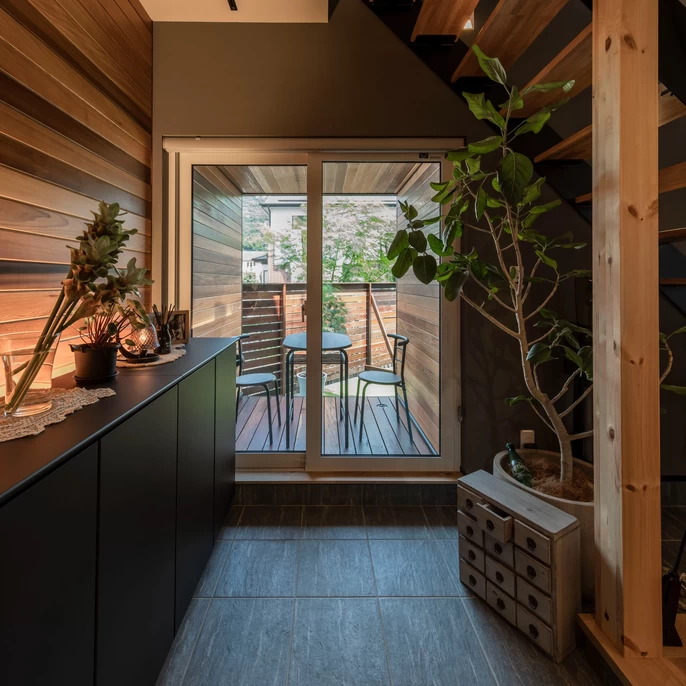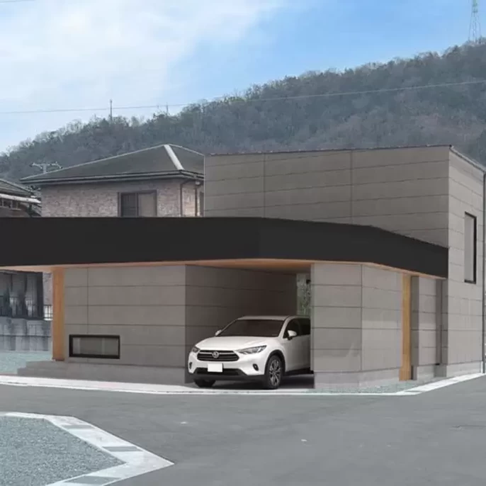 道路からの視線を気にせず、でも完全に閉じない大きな軒が、外の光や風をコントロールし、程よい距離感で外と繋がる心地よい空間を生み出します。雨に濡れずにお家に入れるガレージもポイントです。