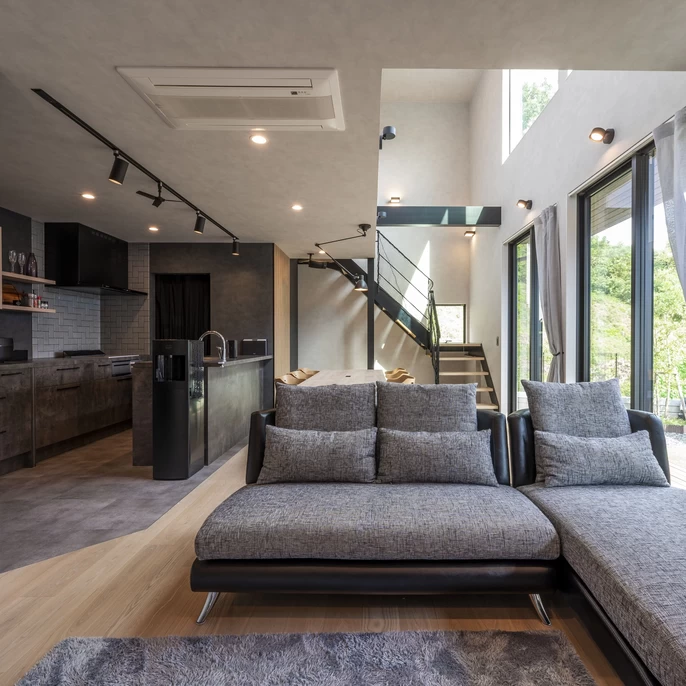 吹き抜けと大きな窓があるLDKは開放感にあふれています。2階のファミリールームと繋がっているので、家族の気配を感じつつも、それぞれの時間を過ごせます。