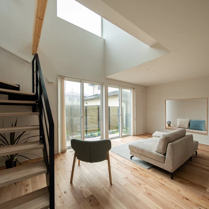 広がる空間に設けられた吹き抜けの窓は、外の光をたっぷりと室内に取り込みます。日差しが降り注ぐリビングは、時間帯によって表情を変え、視線を自然と外へと誘い出します。これにより、家にいながらにして自然と触れ合える時間が生まれます。
