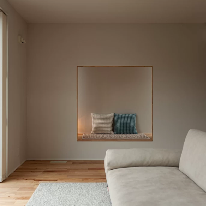 家の一角には、景色に溶け込むヌックを設けています。この小さな隠れ家は、読書をしたり、日々の疲れを癒したりと、多目的に使えるプライベートな空間です。窓から広がる景色を眺めながらのひとときは、心に落ち着きをもたらします。