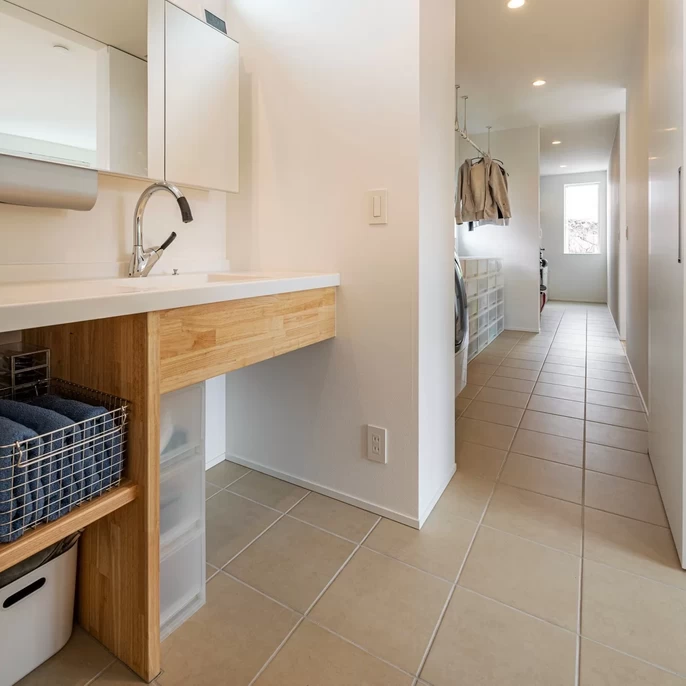 日々の家事をスムーズにするために、洗濯をする〜干す〜片付ける、が一直線に配置。さらに居住スペース、水回り、主寝室を全て1階に集約。人気の1階完結型住宅です。