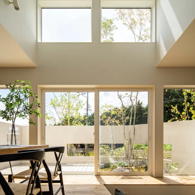 大きな窓の先にはウッドデッキにつながる庭を設計。塀で囲まれているため、外の視線を気にすることなくお家時間を楽しめます。