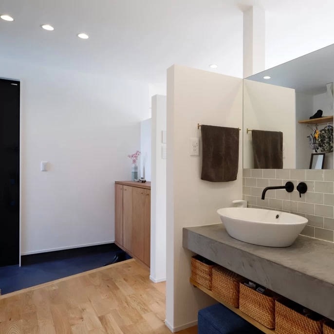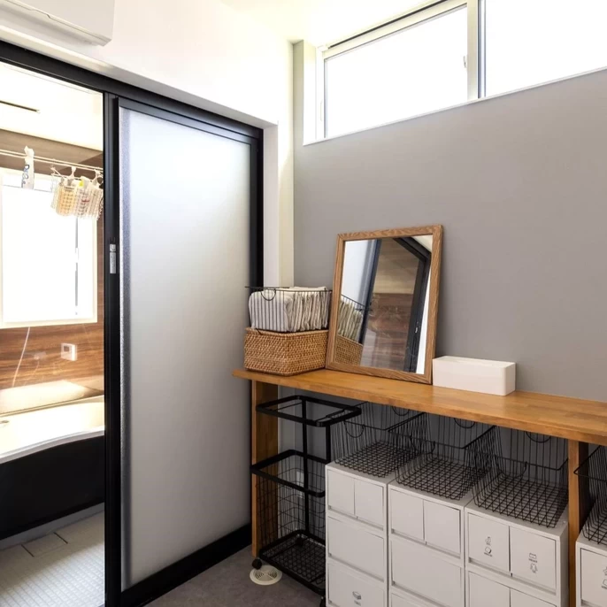 キッチンから洗面・脱衣室へのアクセスもスムーズで、日々の家事負担を大幅に軽減するコンパクトな動線を実現しています。脱衣スペースには、洗濯乾燥機から取り出した洗濯物をすぐ畳めるカウンター収納を設置。日々の家事をやりやすくしています。