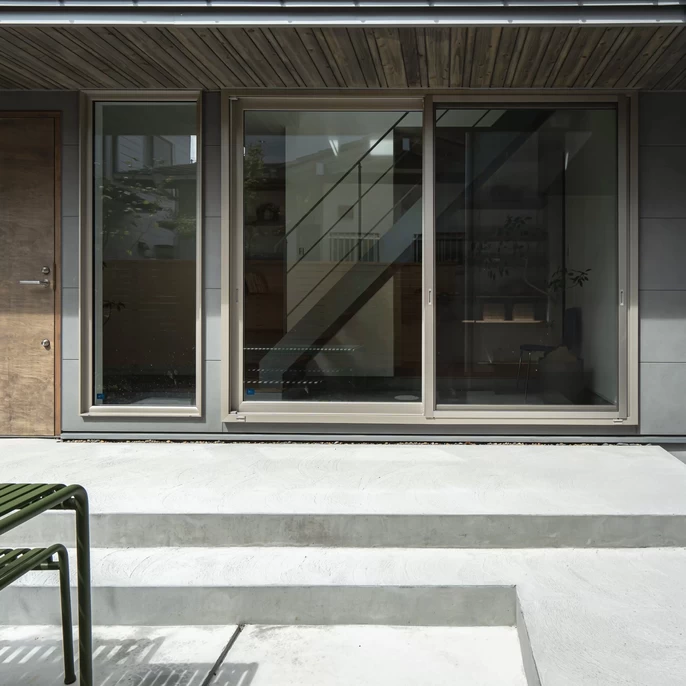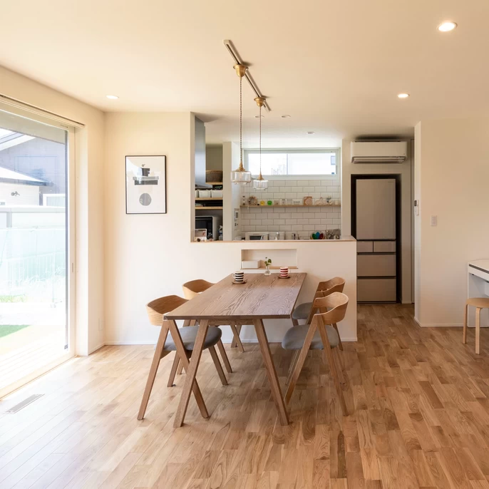 シンプルモダンな平屋建ての外観に 、LDKと庭、外の風景が一体となってつながる大きな開口部が特徴です。玄関を中心にプライベートとパブリックな空間を明確に分け 、水回りを集約したコンパクトな家事動線を実現。家族のつながりとプライバシー、日々の暮らしやすさを両立させた、機能美あふれる住まいです。