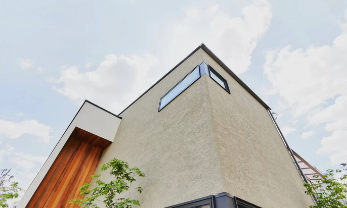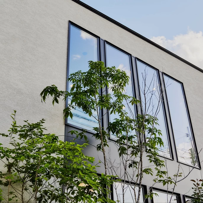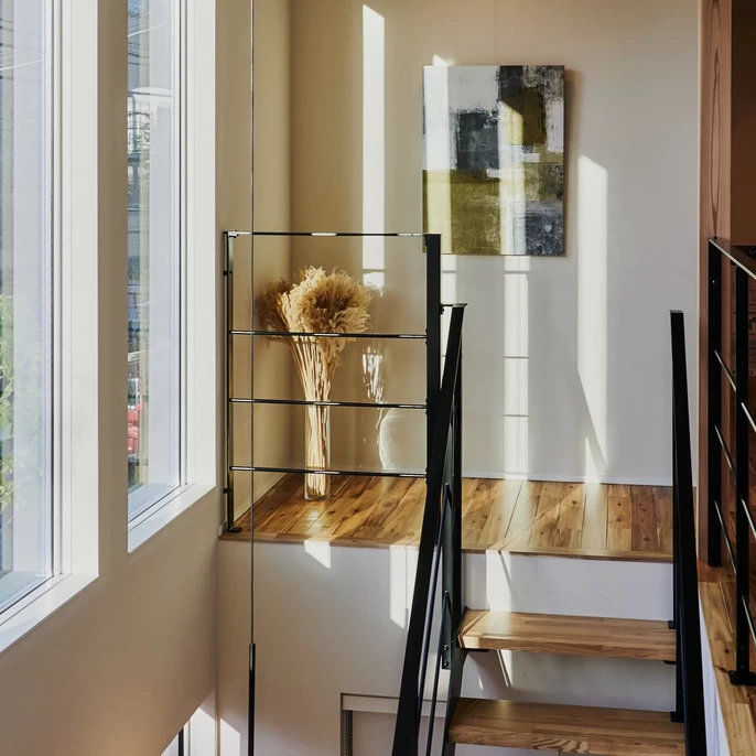 太陽の光が取り込みづらい北側道路に面しつつも、建築家による工夫設計で問題解決。大きな窓と吹き抜けが、空からの光をLDKの隅々まで運びます。建築地の課題を読み解く設計力で、光に満ちた解放感ある暮らしをお届けします。