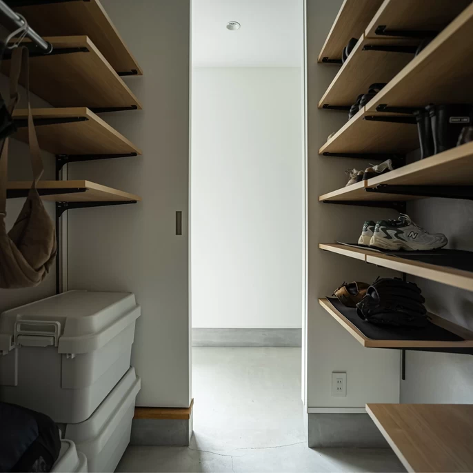 旧居のお悩みを解決するため、玄関横に大容量の土間収納を設計。アウトドア用品やベビーカー、ふるさと納税のストック品まで、まとめて収納可能です。