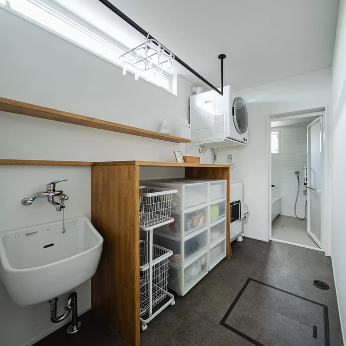 「洗濯〜乾燥〜収納」が一部屋で完結する、室内干し完備の「脱衣&家事室」をご用意。天候や時間を一切気にせず洗濯ができる動線は必見です。また、愛犬のお散歩帰りを想定し、玄関からすぐの場所に手洗いスペースを設置。日々の小さなストレスを解消できるイメージをお持ちいただけます。