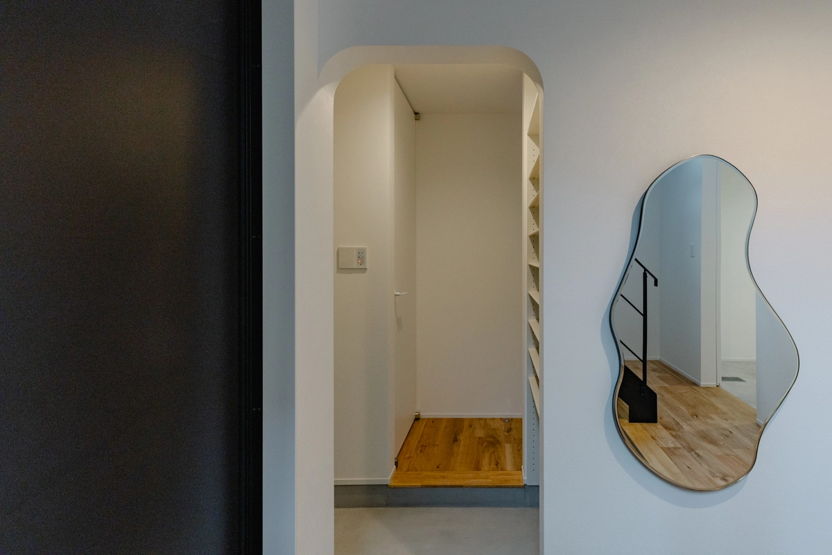 アーチの框や壁、こだわった照明など、家に一歩足を入れた瞬間から心が躍るような玄関に仕上がりました。