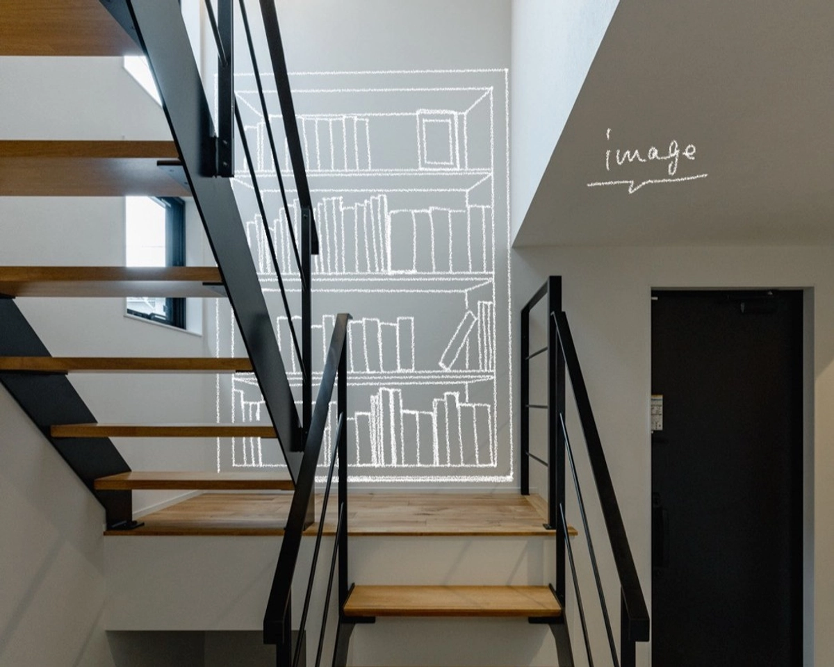 階段横に本棚を設置し、階段に座って読める “階段図書館” や、バルコニーの手前をフリースペースとして、余白を楽しんだりと、注文住宅ならではの自由な発想で家づくりを行いました。