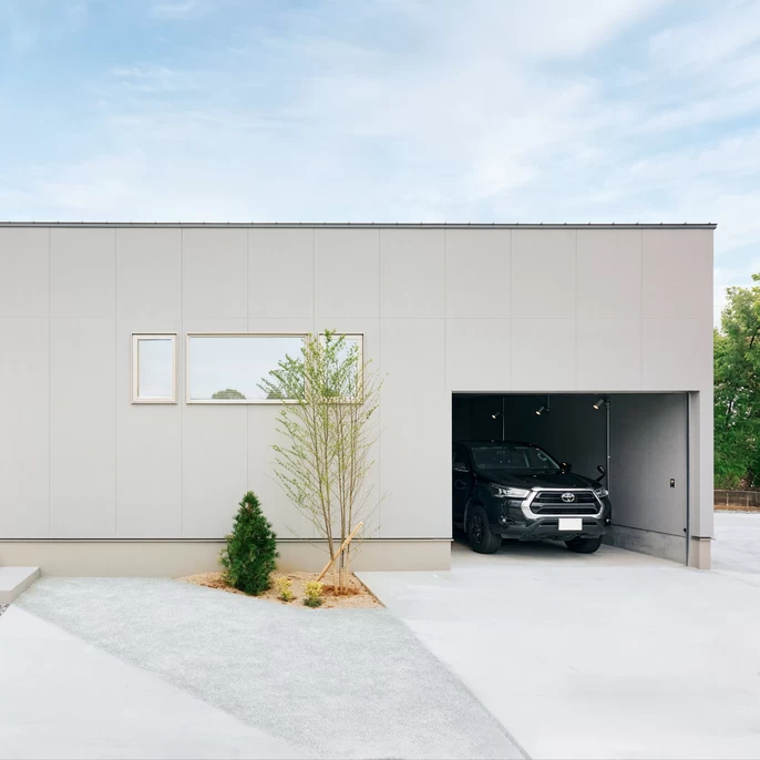 単なる駐車場ではなく、愛車をいじるための「基地」。ガレージから趣味部屋、そして室内へと繋がります。