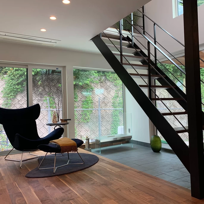 オブジェのような鉄骨階段を設計。2階の気配も感じやすく一体感がある間取りとなっています。