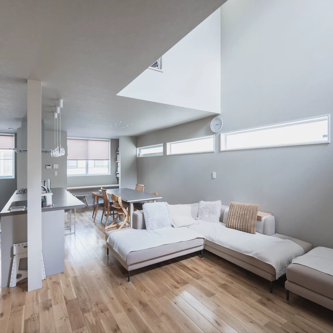 この物件の敷地は、周囲を住宅に囲まれており、特に南側の建物には玄関が面しているため、一般的な設計で南側に大きな窓を設けると、目隠しのために高い塀を立てたり、大きな樹木を植えたりしない限り、常にカーテンを閉めて暮らすことになってしまうという課題がありました。建築家の巧みな設計手法により、プライバシーを守りながらも、明るく開放感のある室内空間を実現しました。