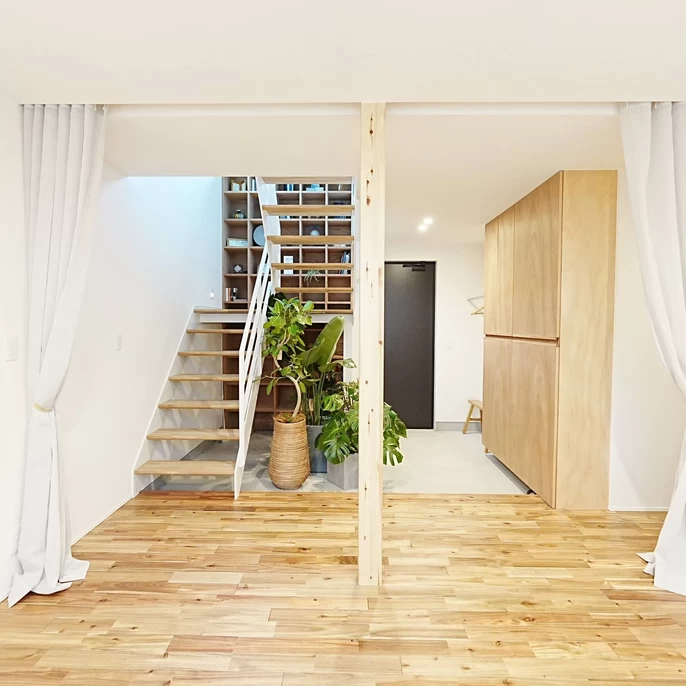 階段下とつながる広々とした土間空間は、暮らしを豊かにする多目的スペース。来客時にはカフェのようなおもてなしの場に、趣味の時間にはキャンプギアのメンテナンスやDIYを楽しむ作業場にもなります。フレキシブルに使える土間が、ライフスタイルをさらに魅力的に彩ります。