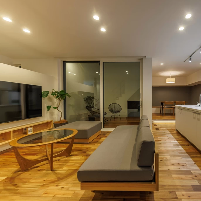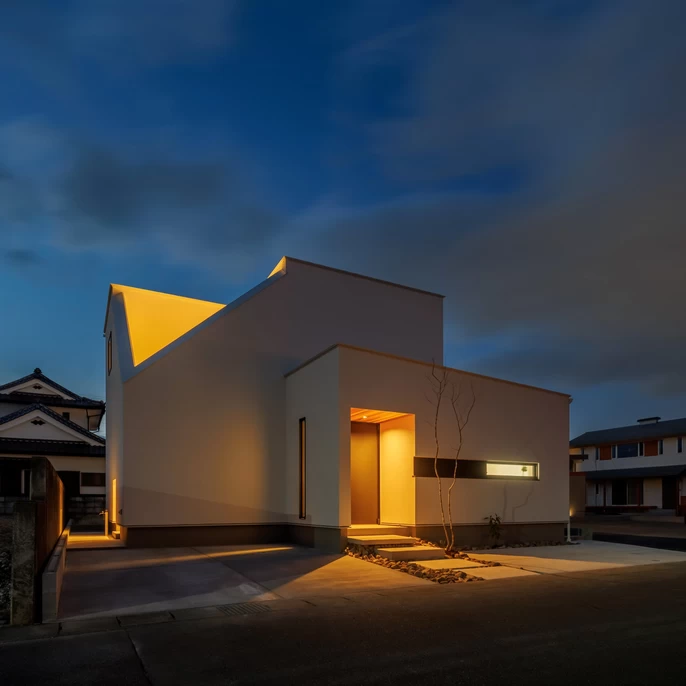 外からの視線を遮る「閉じた」デザインは、家族だけの穏やかな時間を守るための工夫です。斜めに切り取られた壁のラインや、計算された窓の配置。シンプルな中にも遊び心を感じさせる外観が、街ゆく人の印象に残ります。