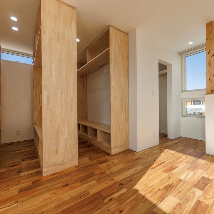 2階はあえて作り込みすぎず、「可変性」を持たせました。主役は可動式のファミリークローゼット。子供の成長や家族構成の変化に合わせて、部屋を仕切ったり繋げたり。未来の暮らしに寄り添う設計です。