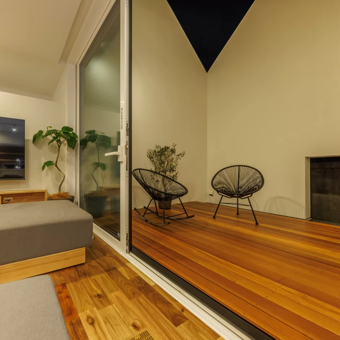 テラスに面した大きな窓が、たっぷりと自然光を取り込みます。カーテンレスで周辺の視線を気にせず子どもたち遊んだり趣味に使ったりとさまざまな目的で使用できます。V字ラインが周囲の雑多な風景を遮り、空だけを美しく切り取って見えるテラスです。