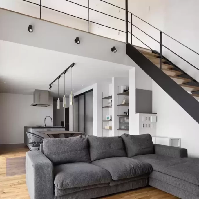 スケルトンの鉄骨階段と勾配天井の吹き抜けにより、広く感じるリビングになっています。