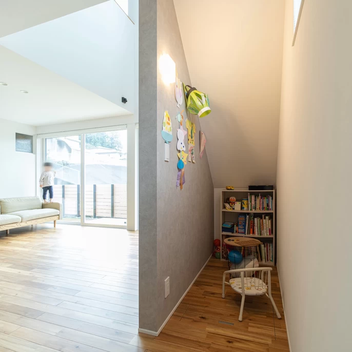 お施主様の要望はプライベートな中庭、帰宅時にカバンを置いておけるスペースなど、収納にもこだわりが詰まったお家が完成しました。階段下の秘密基地空間も必見、1年を快適に暮らすパッシブデザインの高性能住宅をぜひご体感ください。