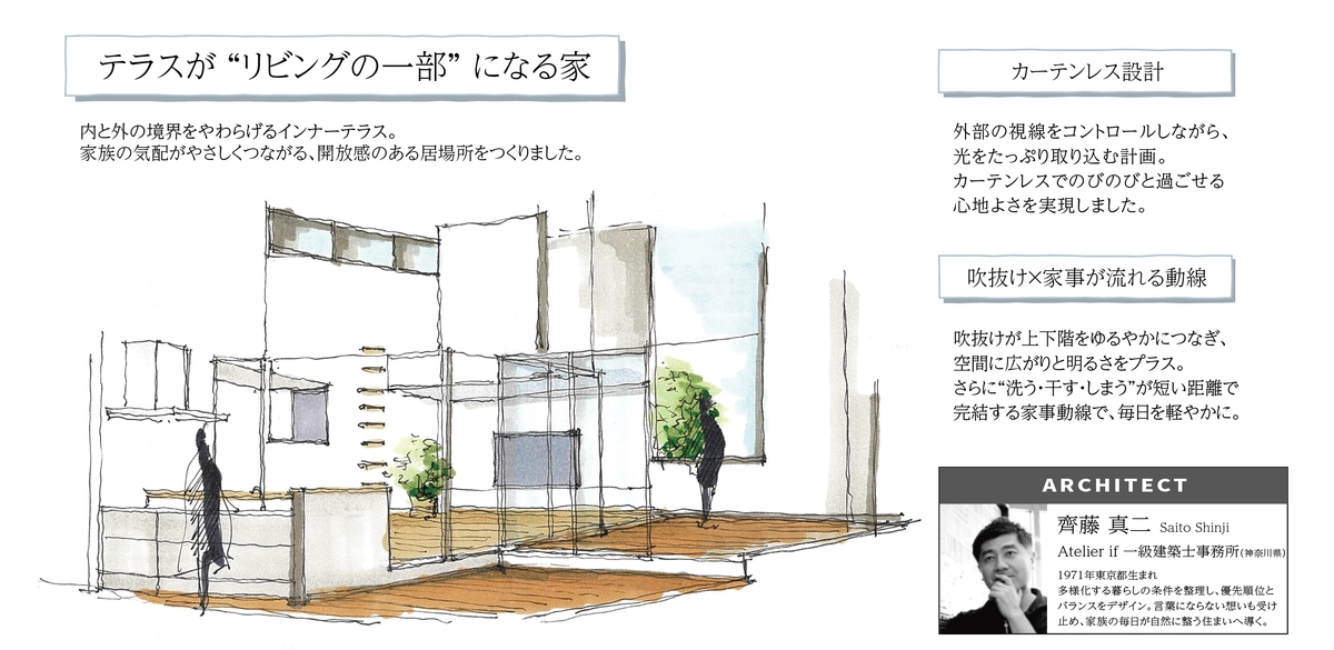 今回のテーマは、「テラスが“リビングの一部”になるカーテンレスの家」。