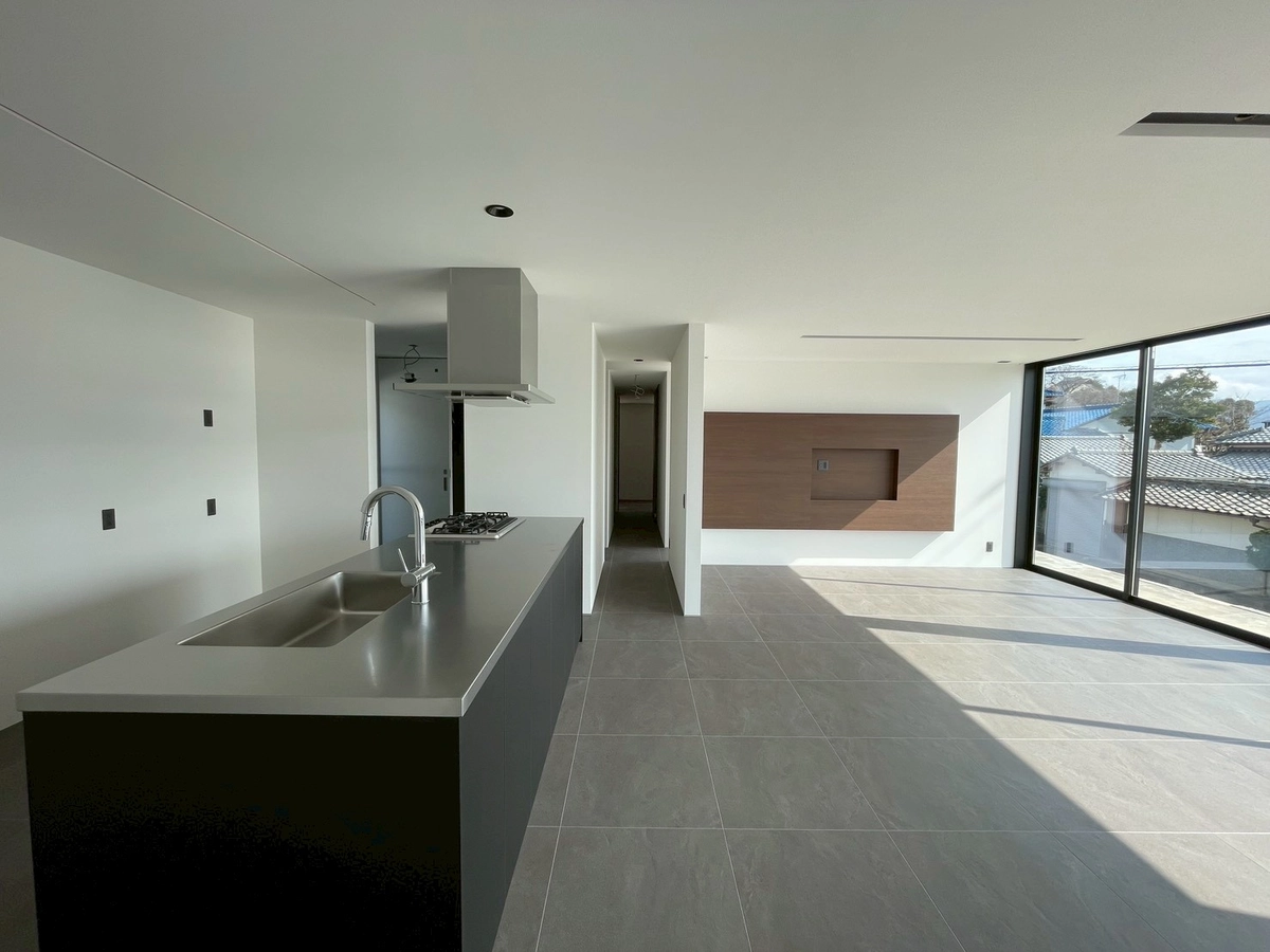 南からのやさしい光が差し込むリビングは、家族や友人が自然と集まる、明るく心地よい空間です。