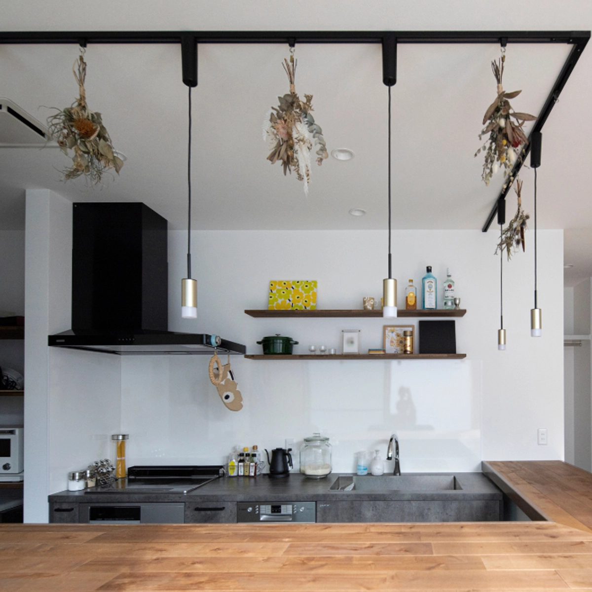 キッチンを囲むように作られたコの字型のカウンターは広めに設計し、ダイニングテーブルとしての機能も兼ね備えています。