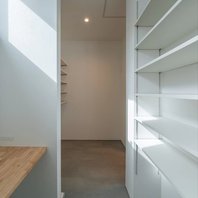 キッチンの奥に隠された秘密基地のようなパントリーは。左右の壁面には食材や日用品をたっぷりストックできる棚を完備し、買い置きにも困りません。ちょっとした作業ができるカウンターも備えています。