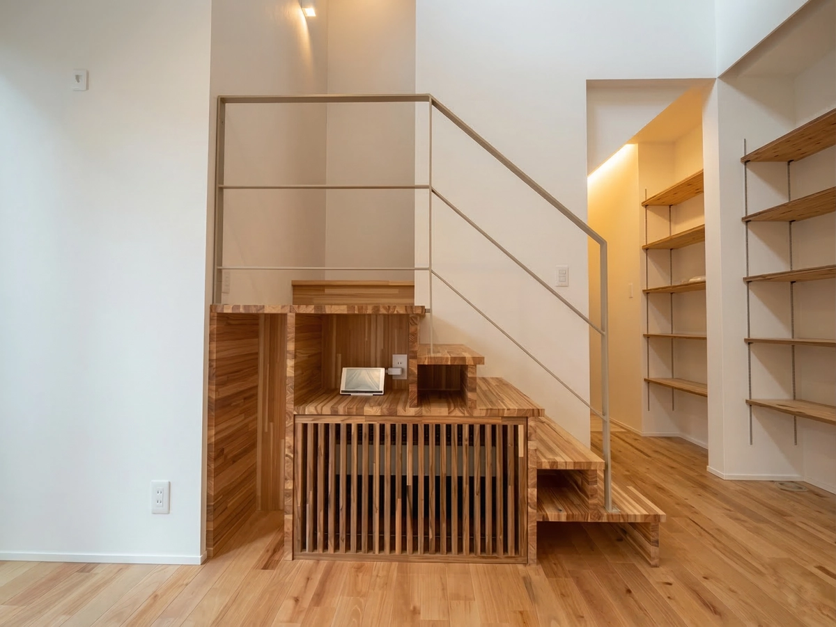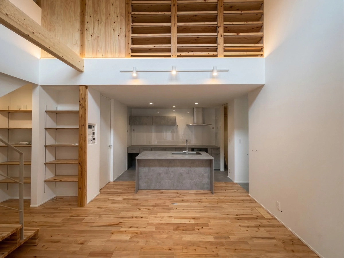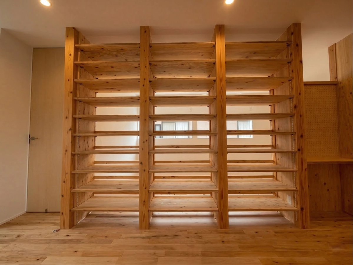 その壁一面を埋め尽くす巨大な収納棚には、お施主様の「趣味」が美しく並び、家族の物語を刻みます。