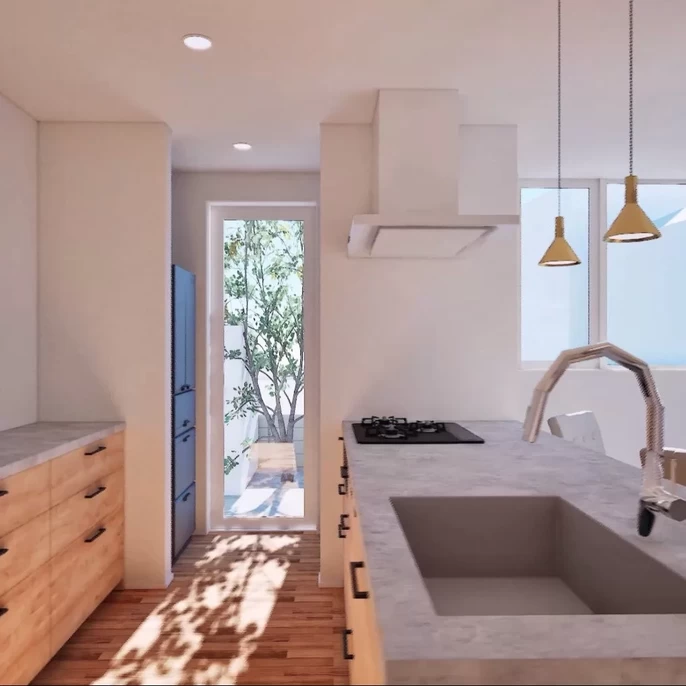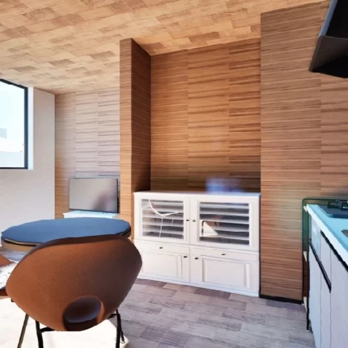 LDKの中央にキッチンを配置し、さらにキッチンの裏動線として洗濯・脱衣室へ直接アクセスできるよう計画しました。冷蔵庫はリビングから見えない位置に配置し、生活感を抑えつつ使いやすさも確保。さらに背面に勝手口を設けることで、買い物後の収納やゴミ出し・洗濯といった日々の家事もスムーズに行えます。“見せない工夫”と“動きやすさ”を両立させた家事ラク設計で、忙しい毎日をやさしくサポートします。