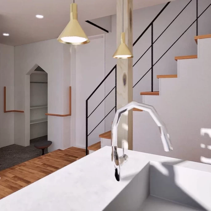 階段を1階の中央に配置することで、LDKとお母様お祖母様・叔父様それぞれのお部屋へ、プライバシーに配慮しながらもアクセスしやすい計画としました。家族とのつながりを感じながらも落ち着いて過ごせる、ほどよい距離感を大切にした設計です。さらに、水まわりへもスムーズにアクセスできる動線を確保し、日々の暮らしやすさにも配慮しています。