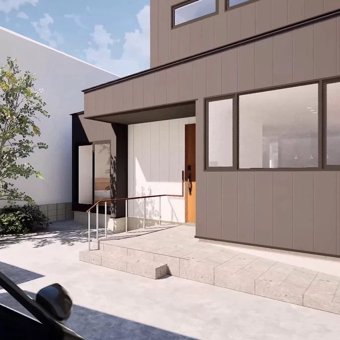 建物に沿って設けた長いスロープは、動線を邪魔せずスムーズに玄関へと導きます。広々とした玄関ポーチは手すりを設置し、自転車や手押し車もゆとりをもって置ける安心設計。毎日の出入りを快適にサポートします。