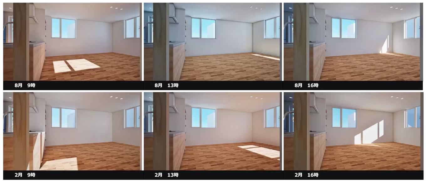 ●南窓:8時頃から日射取得できている様子がわかる。お昼頃には十分な光が差し込み、17時頃まで日射取得できている様子がわかる。