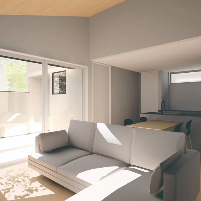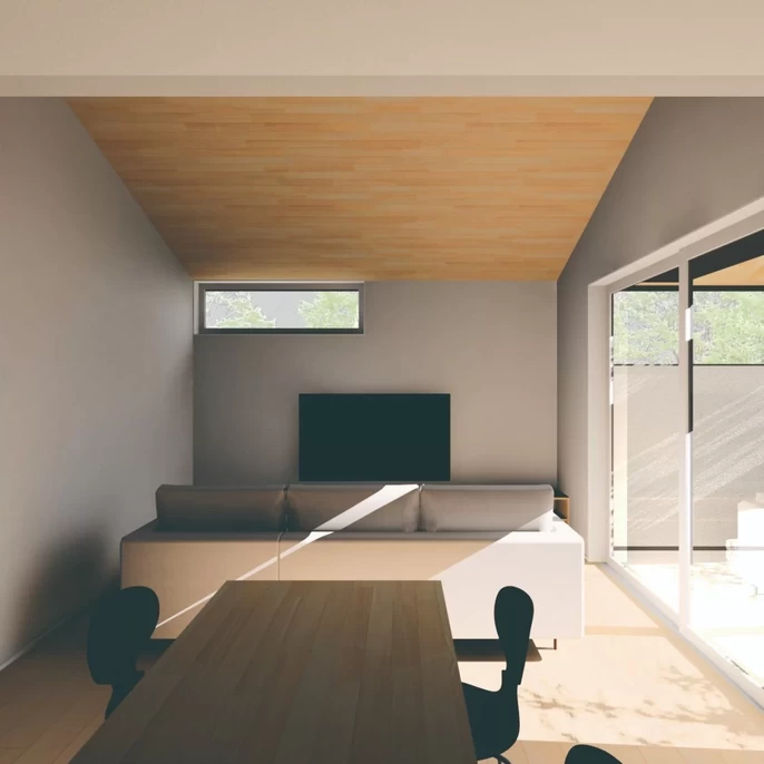 コンパクトな平屋ながら、リビングの勾配天井が高さと広がりを生み、ゆとりを感じる空間に仕上げました。必要な場所ごとに、しっかりと収納を設け、すっきりと暮らせる工夫も大切にしています。