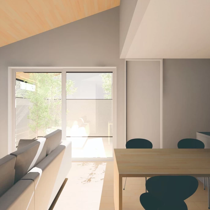 壁に囲まれた中庭を住まいの中心に配置。外からの視線を気にせず、光と風をたっぷりと取り込み、LDKとひとつながりの心地よい開放感を楽しめます。朝の光や季節の風を身近に感じることができます。