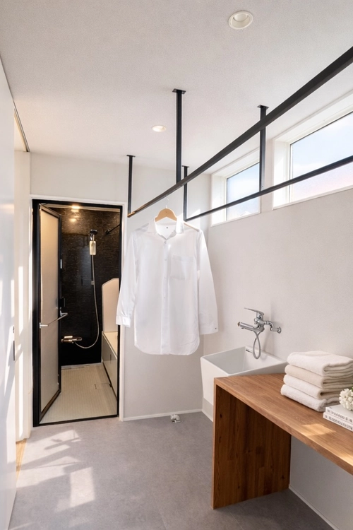 キッチンから洗面、脱衣、ファミリークロークへとぐるりとつながる家事ラク動線。「洗う→干す→しまう」がスムーズにつながり毎日の家事時間を自然に短縮します。