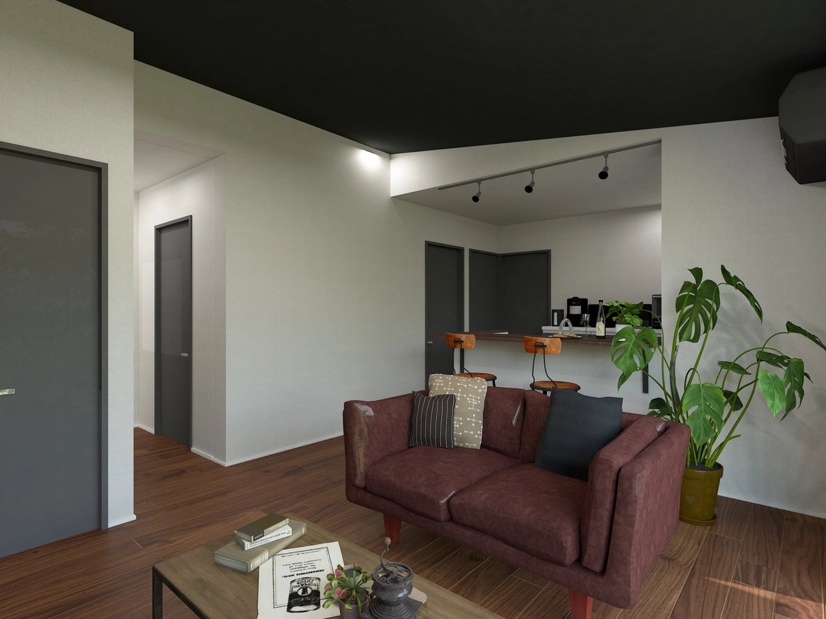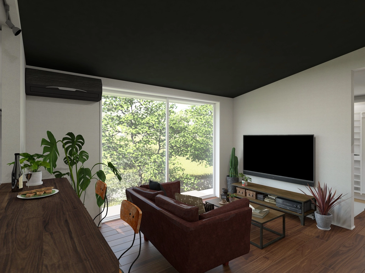 マットブラックの勾配天井を組み合わせた空間。