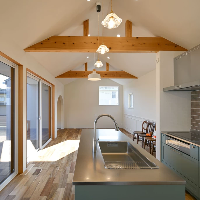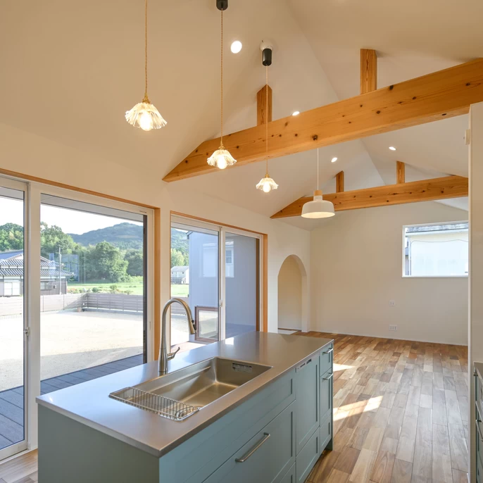 LDKの中心に据えた開放的なキッチンは、勾配天井でさらに広がりを感じさせます。料理をしながら自然の景色を堪能できる贅沢な時間が、毎日の暮らしを豊かにしてくれます。