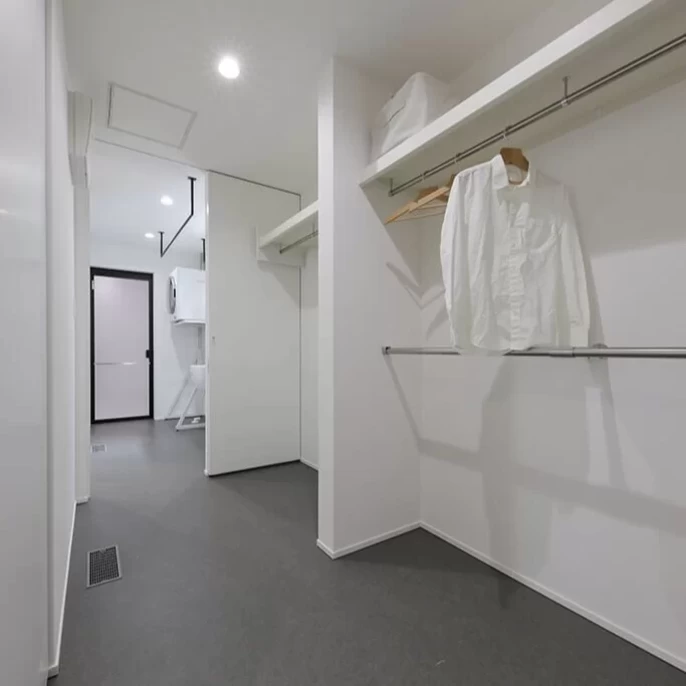浴室、洗濯・脱衣室、WICを一直線に配置し、家事の手間を最小限に抑えています。回遊性のある動線計画により、家中どこからでもアクセスしやすく片づけもスムーズです。室内干しスペースも完備しており、天候を問わず「洗う・干す・しまう」が効率よく完結する設計をぜひご体感ください。