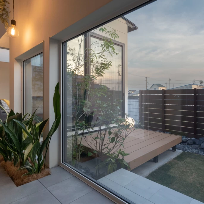 住まいの中心にある約7.5畳の中庭は、縦ルーバーによりプライバシーを確保した完全プライベート空間です 。ルーバー越しに遠くの山々を眺め、季節の移ろいを感じながらお茶を楽しめる「もうひとつのリビング」として機能します 。約18畳のLDKと連続させることで、合計約25.5畳もの圧倒的な開放感を作り出しています 。