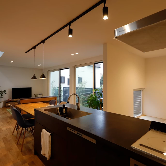 中庭が隣接するリビングは、窓越しに景色を採り込み、18畳の室内と合わせて25.5畳もの開放感を生み出しています。生活動線もしっかり考えており、共働き世帯に嬉しい「洗う・干す・しまう」が一直線につながる動線となっています。利便性だけではなく畳スペースなど 、ゆとりあるスローライフを叶える工夫を凝らしました。