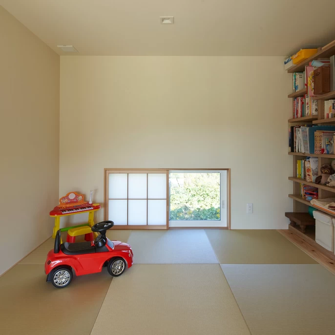 リビングから土間の飛び石を渡ってアクセスする和室は、あえて居住空間と距離を置いた「離れ」のような佇まい。中庭に面した地窓(低い窓)から視線をあえて絞ることで、落ち着きのある静かな時間を演出します。来客時の寝室としてはもちろん、日常を忘れて趣味や読書に没頭できる特別な一室です。
