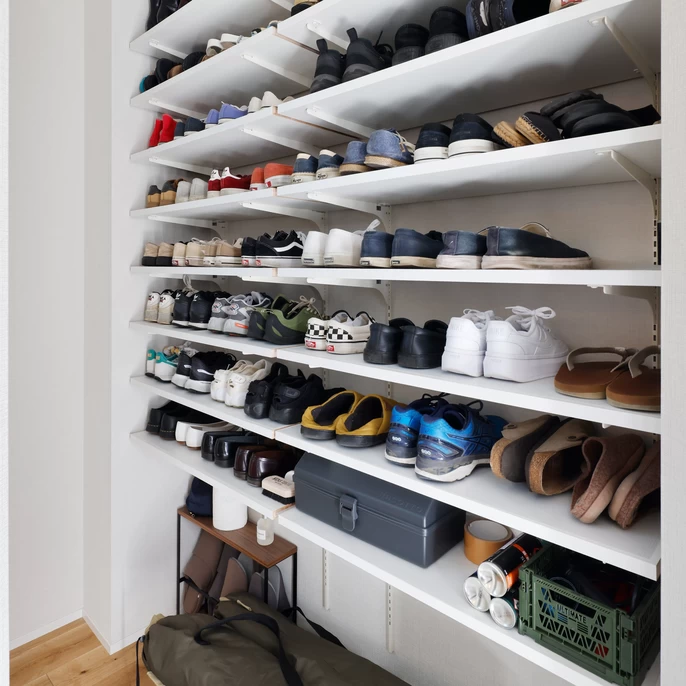 玄関からシューズクローク、ファミリークローゼット、そして洗面へと直結する効率的な裏動線を確保しました。総延長5.5mもの収納力を持つクローゼットは、家族の荷物を一手に引き受けます。重い荷物を置いてすぐに手を洗えるレイアウトは、共働き世帯の忙しい毎日を支えます。