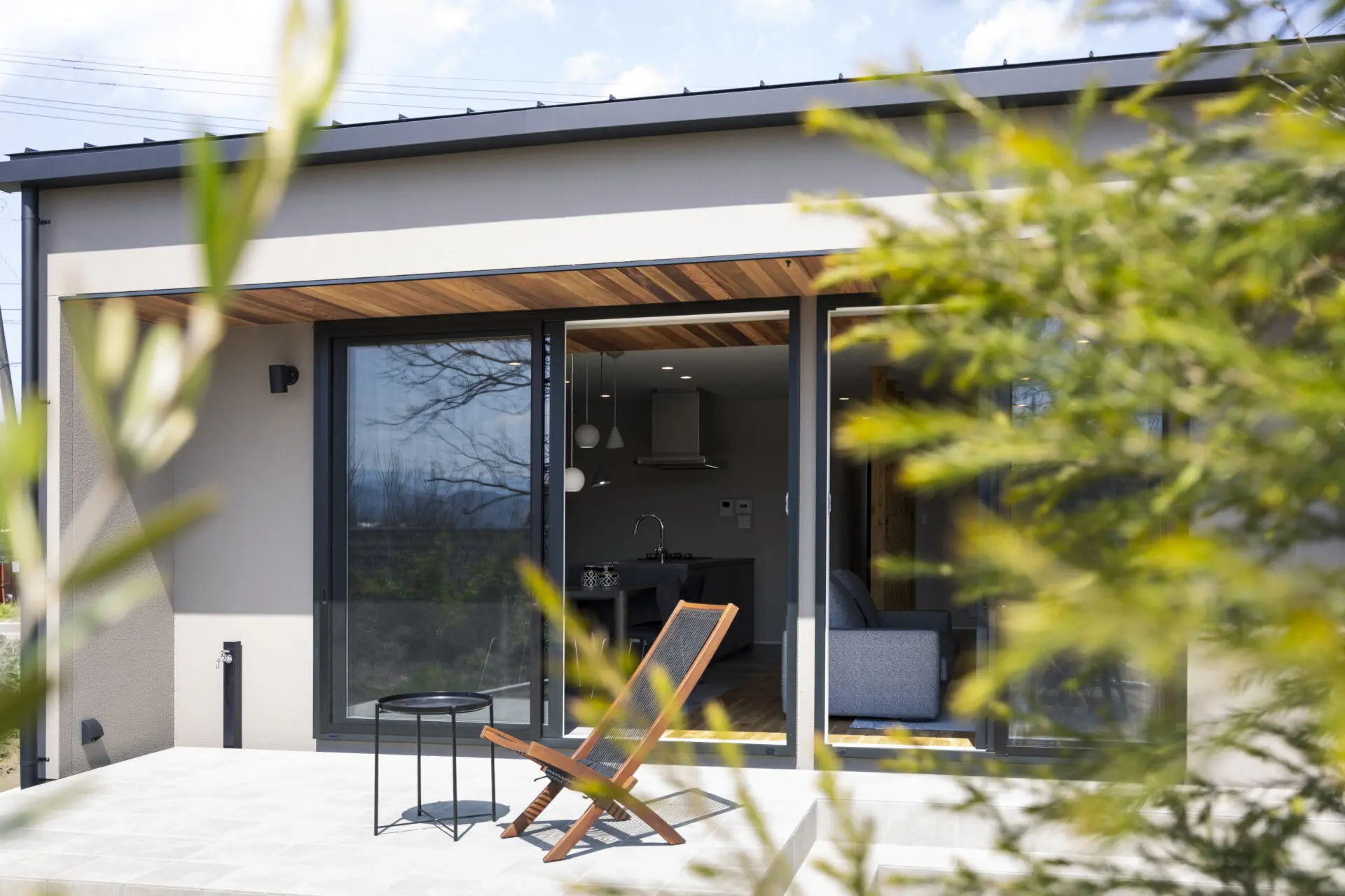 南面の大きな窓と深い軒が、室内と庭をシームレスにつなぎます。