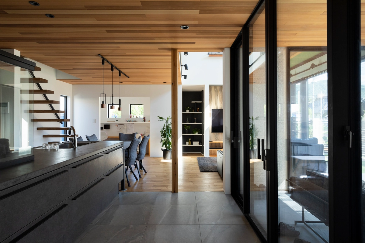 視線の抜け感や空間の連続性を意識したリビング。