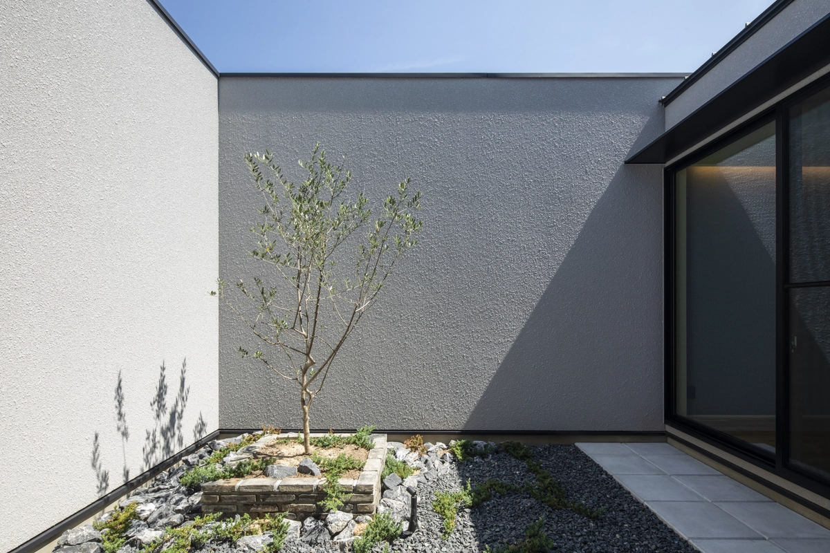 道路側の窓をなくした彫刻的な外観が、プライバシーを守りつつ光と風を招き入れます。