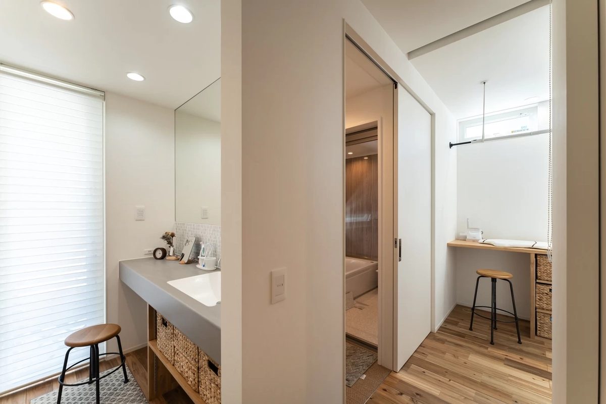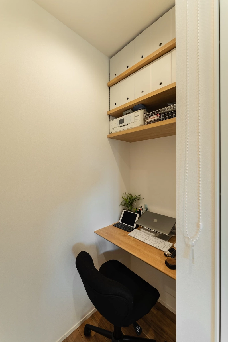 LDKの一角に設けられたワークスペースは、家族の気配を感じつつも、集中して仕事や趣味に没頭できる絶妙な距離感で配置しています。資料をたっぷり保管できる可動棚も完備することで在宅ワークもスムーズ。
