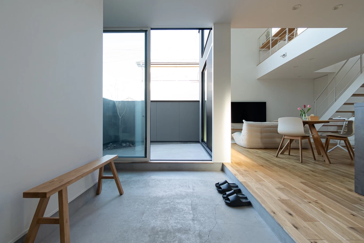 エントランスからリビングまで連続するように配置された中庭。内と外を曖昧につなぐ、内部のような外部空間が、住まい全体に圧倒的な開放感を演出します。高い壁が外からの視線を遮るため、一日中カーテンを閉めずに光や空、四季の移ろいを愉しめる、贅沢な空間です。